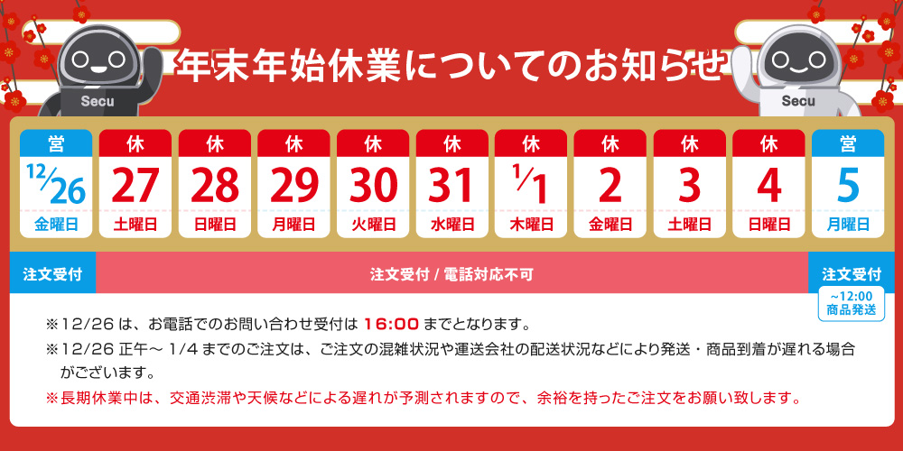 弊社では、誠に勝手ながら下記の期間を年末年始休業とさせていただきます。何卒ご理解賜りますよう宜しくお願い申し上げます。